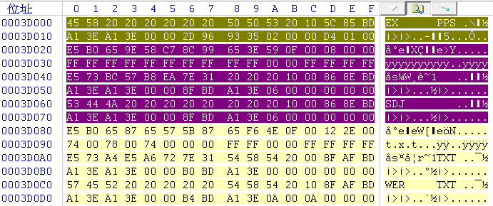 EX.PPS檔案,位址3D01A-3D01B為0x02表示ex.pps存放在第2磁叢的位址,位址3D00B為0x20表示為檔案。