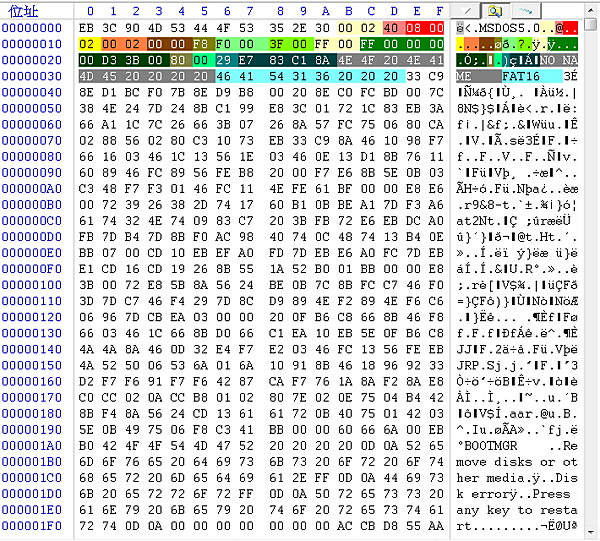 | BPB_BytsPerSec | 0B-0C | 2 | 每一磁區的位元組數。一般為 512 個位元組,但也可以是